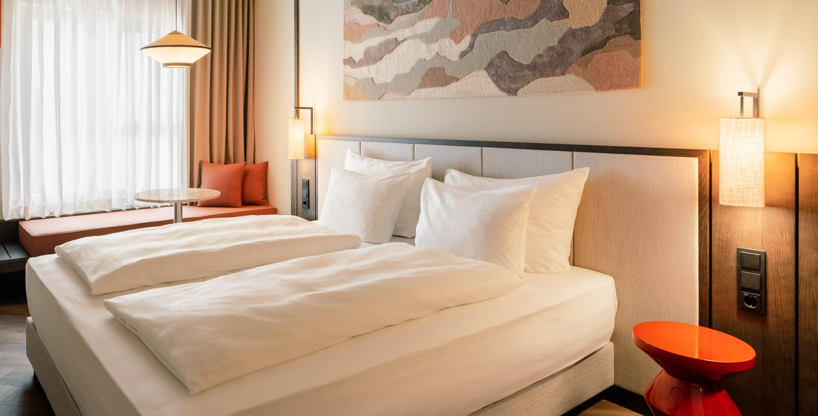 Während du auf einem privaten Balkon die Sonne genießen und dabei das Treiben im Garten beobachten kannst, lädt die Ausstattung deines Smart Balcony Zimmers zum Entspannen ein. Das Doppelbett mit Federkernmatratze verspricht erholsamen Schlaf, die Regendusche erfrischt nach einem ereignisreichen Tag und der praktische Arbeitsplatz macht dein Zimmer auch für kurze Arbeitsmomente ideal.