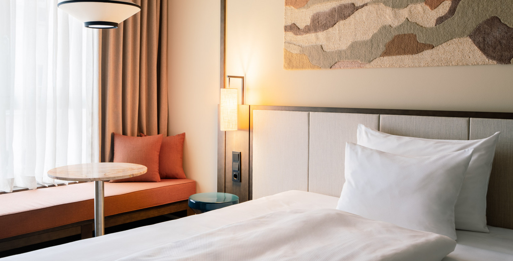 Dank der vielen schlauen Details genießt du in unseren Smart Single Zimmern maximalen Wohnkomfort. Eine gemütliche Fensterbank mit Blick auf das Karmeliterviertel lädt zum gemütlichen Knotzen* und Beobachten ein – und auf dem französischen Doppelbett kannst du dich nach Herzenslust ausstrecken, bevor du von den vielen eindrucksvollen Erlebnissen des Tages träumst.