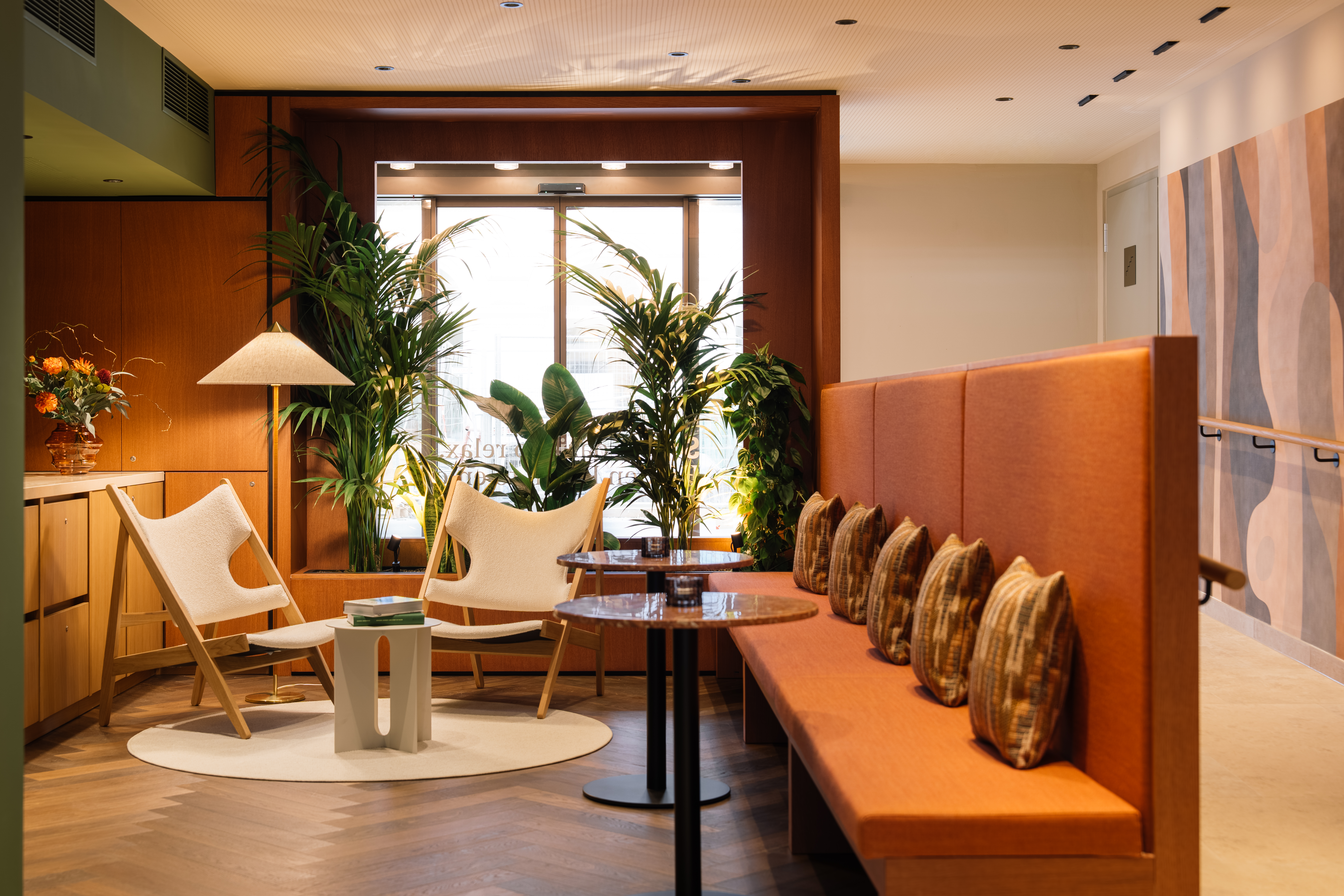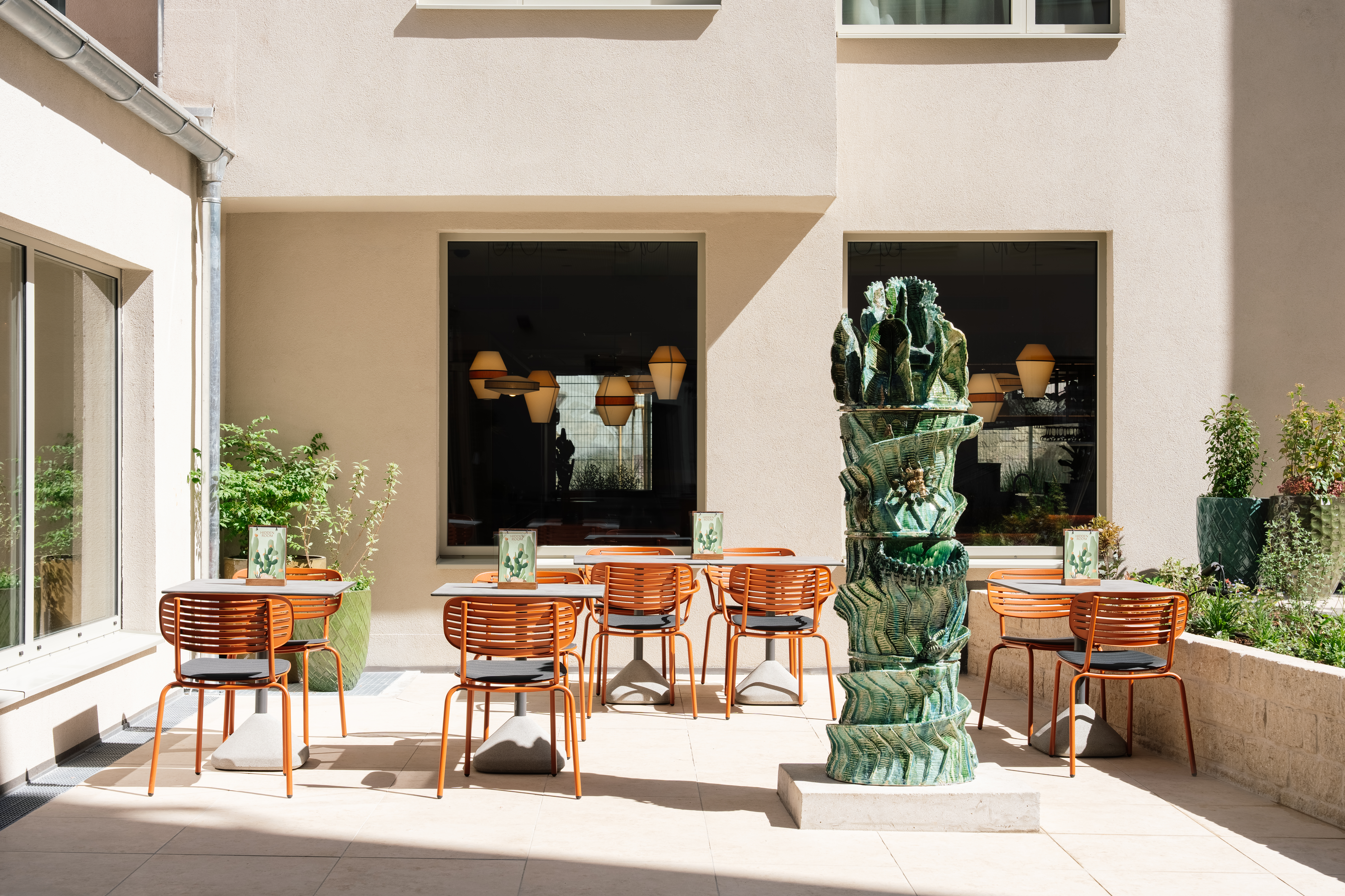 Gemütliche Sitzmöglichkeiten mit Blick in den Garten im Hotel Schani City